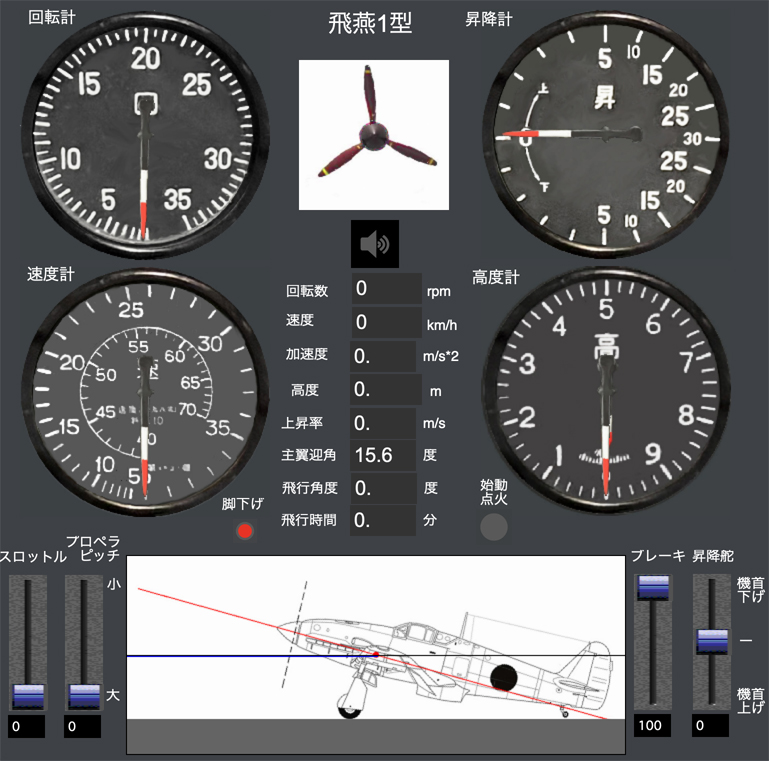 そうなると、次はやはり飛行中の音を合成したくなります。そこでさらに研究した結果、数年かけてなんとか飛行機の運動物理モデルを作成することができました。まだ、上昇下降や宙返りなどの縦運動しかできませんが、かなりの精度で機体の運動を模擬することができますので、飛行中のエンジン回転数も問題なく計算できるようになりました。