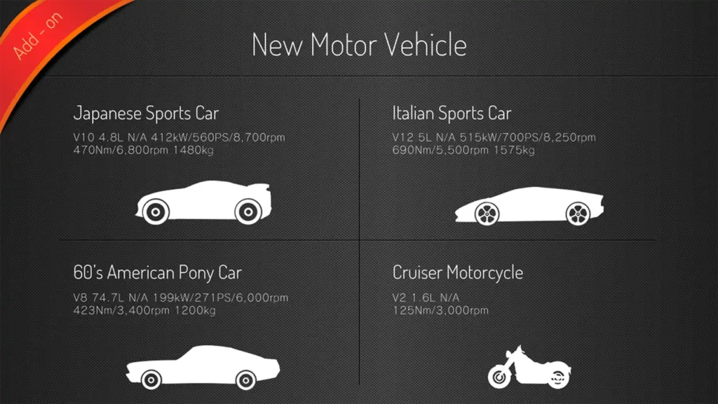 また、本アプリでは精密な車両物理モデルを用いていますので、エンジン回転数や走行速度は実車の挙動を正確に模擬しております。